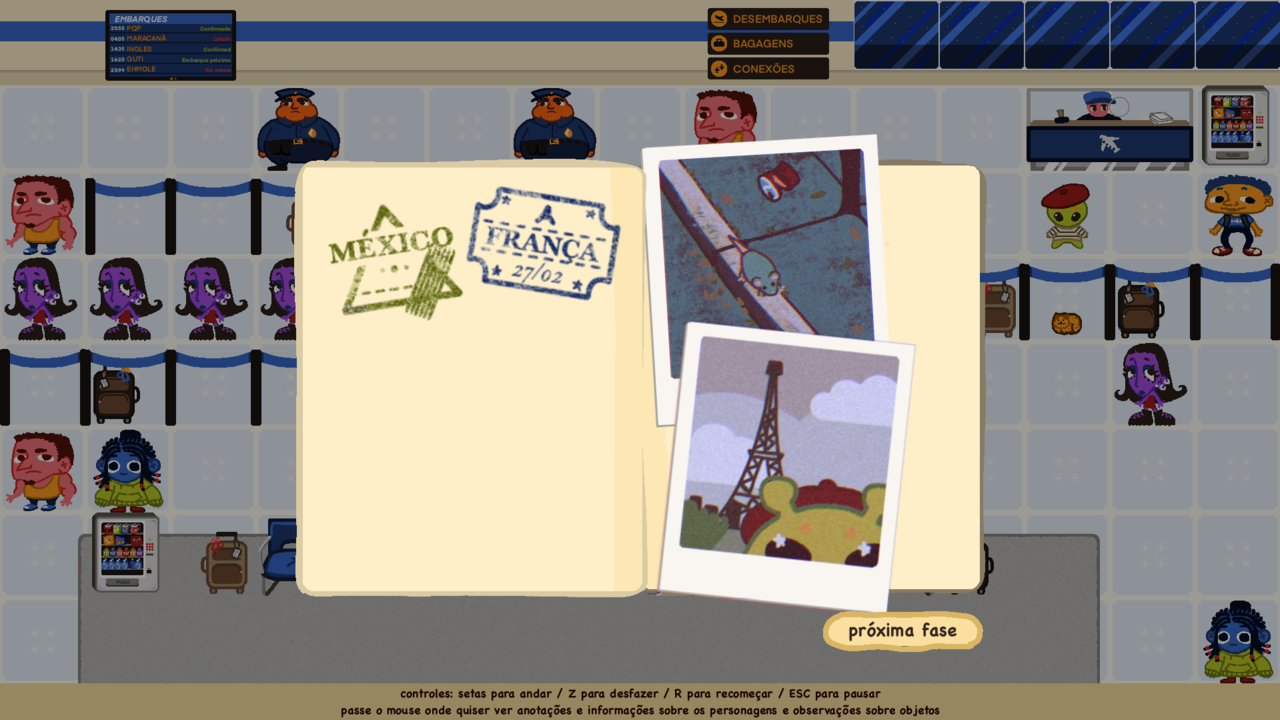 Nesse jogo puzzle estilo Sokoban, você é um alienzinho com o objetivo de chegar ao guichê em cada uma das 7 fases para conseguir o passaporte com mais carimbos de todos! Interaja com os personagens e descubra o que eles fazem pra te ajudar a furar a fila e conseguir seu carimbo!